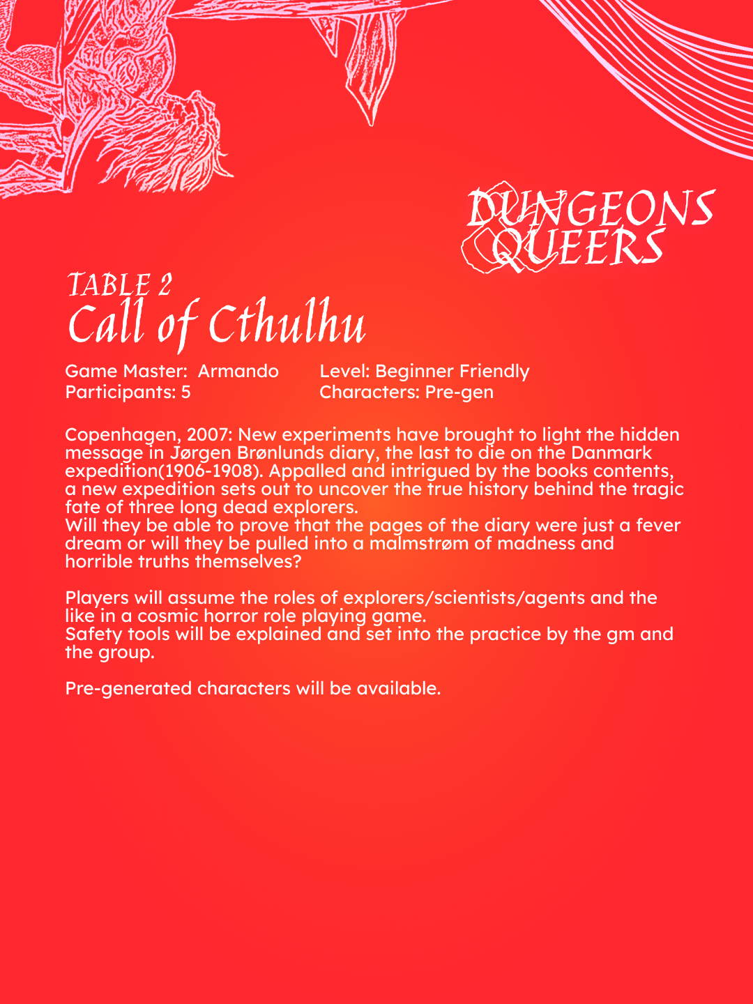 Welcome all adventurers, new and old! Dungeons & Queers is for the fifth time bringing you the Dungeon of Dungeon & Queers at DAS, we come out of the cozy homestead of LGBT+ Denmark to invite you for an evening of table-top role playing games with the purpose of creating a space for people in the queer community where we can engage in fun, small adventures, with no limit to how you look, who you are or what you do!